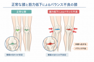 これらは、筋力低下による膝のバランス不良が関係している
